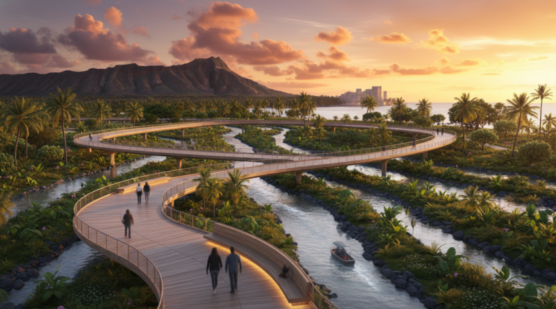 One striking proposal involves transforming sections of Kalakaua Avenue into a “blue-green corridor” — a landscaped waterway that normally serves as an attractive pedestrian promenade but can channel floodwater safely toward the ocean during storm events. The design incorporates native Hawaiian plants that thrive in both wet and dry conditions.