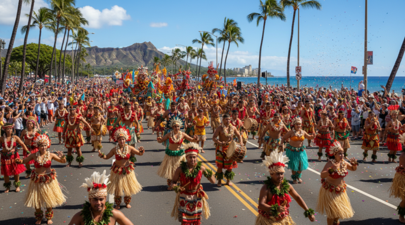More than 3,000 performers from across the Pacific Rim took part in Saturday’s grand parade along Kalakaua Avenue, representing countries including Japan, Korea, Australia, Tahiti, and the Philippines. The procession stretched nearly two miles from Fort DeRussy to Kapiolani Park, featuring elaborate floats, traditional costumes, and live music that had spectators lining the sidewalks six deep.